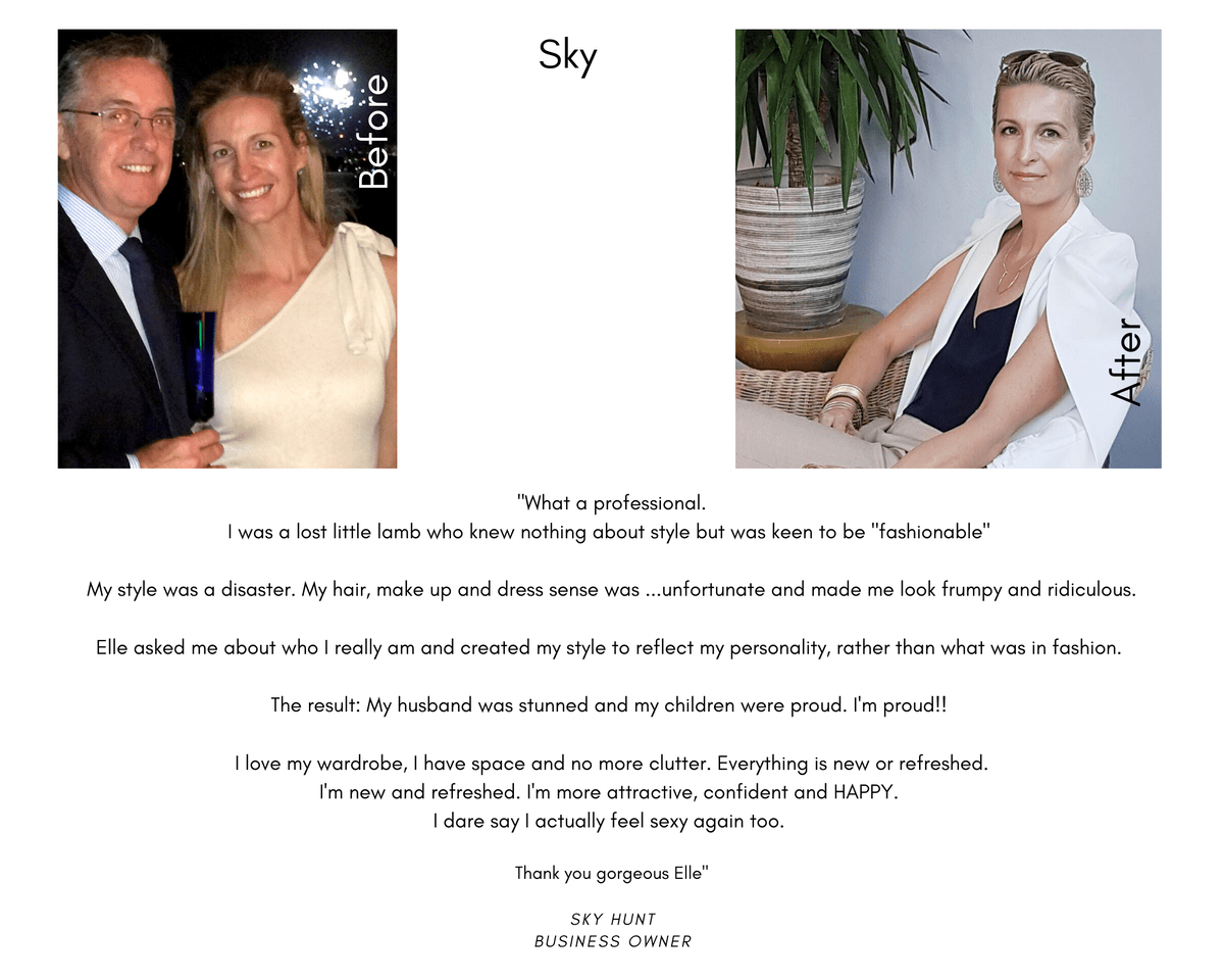 “ Since Elle has styled me, I have had nothing but positive comments from everyone about how good I look, not only from friends but even from complete strangers. I feel more confident and love going out. It's an adventure every morning to decide what I shall wear that day. Thank you Elle!